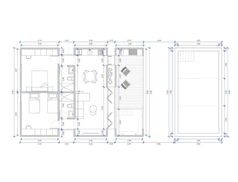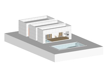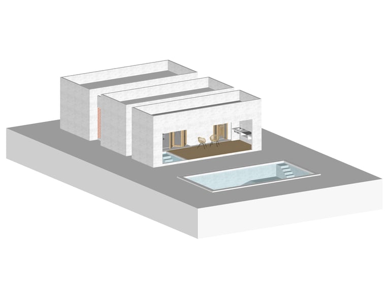Proyecto de casa de campo desarrollado en una sola planta, organizado a partir de una distribución funcional que integra dormitorios, servicios y un área social central con conexión directa hacia terrazas exteriores y zona de piscina. La propuesta prioriza la relación entre interior y exterior, el uso de espacios abiertos, la iluminación natural y una circulación clara, pensada para el descanso y el uso recreativo.