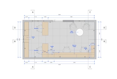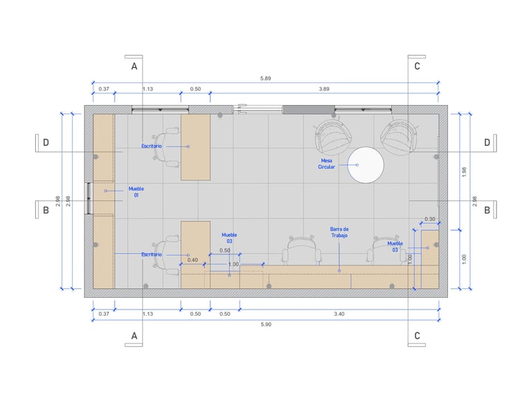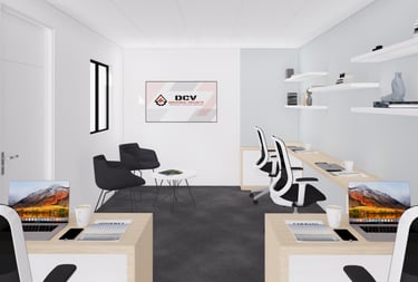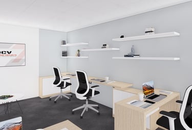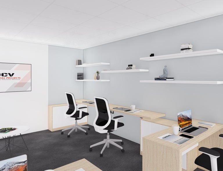 Oficina diseñada con dos puestos de trabajo principales, una zona operativa y un espacio de espera. El ambiente se organiza de manera simple y funcional, con mobiliario limpio y una distribución que facilita el uso diario.